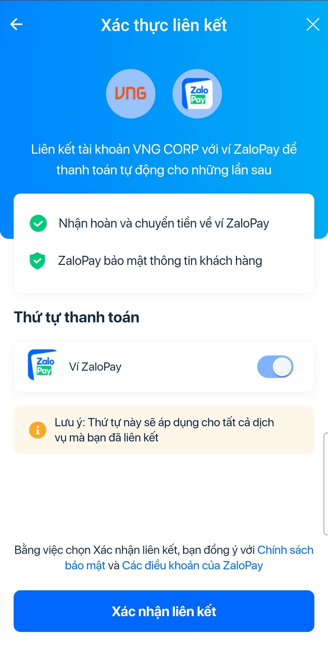Bước 3: Hệ thống sẽ chuyển Cao Thủ đến app ZaloPay – Giao diện Xác thực liên kết, chọn “Xác nhận liên kết”.