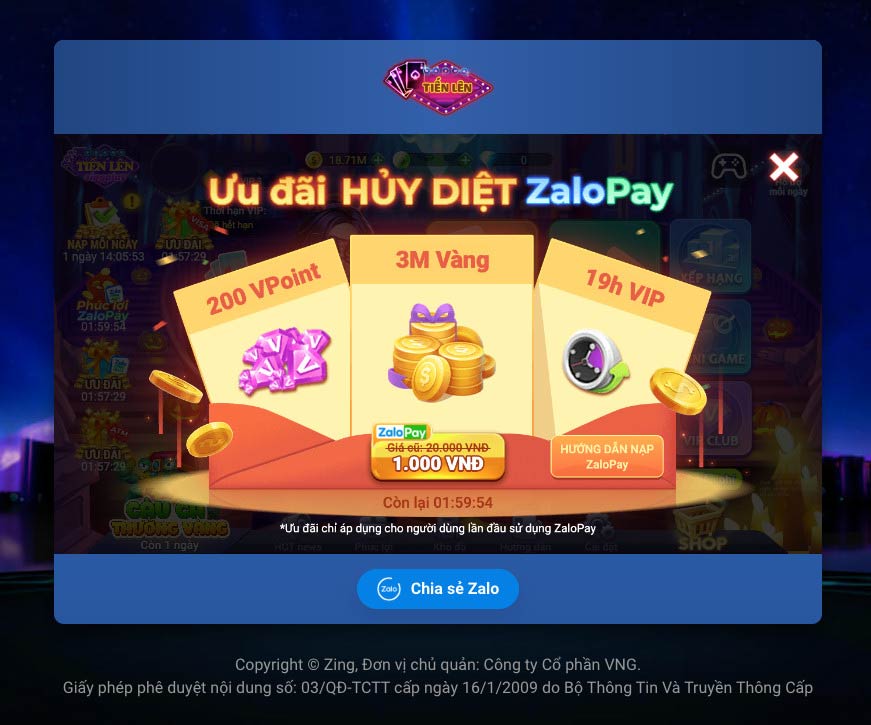 Ưu Đãi Hủy Diệt nạp duy nhất 1.000 VNĐ - Nhận ngay 3M Vàng, 200 VPoint cùng 19h VIP từ gói 20.000 VNĐ dành cho Cao Thủ chưa từng thanh toán ZaloPay ở bất kỳ game nào đã sẵn sàng. Đừng bỏ ưu đãi khủng số lượng có hạn này Cao Thủ ơiii !!!
